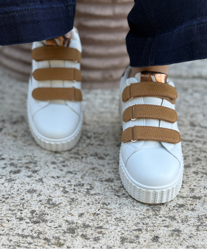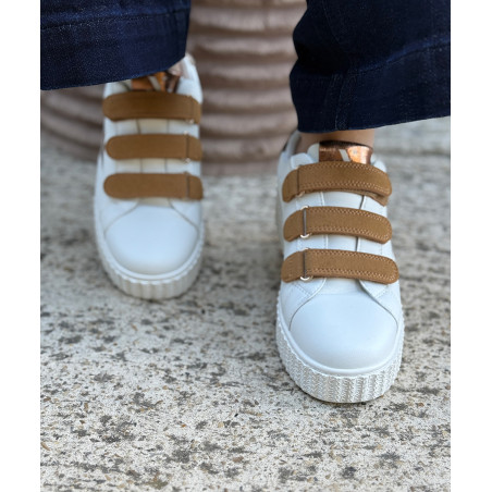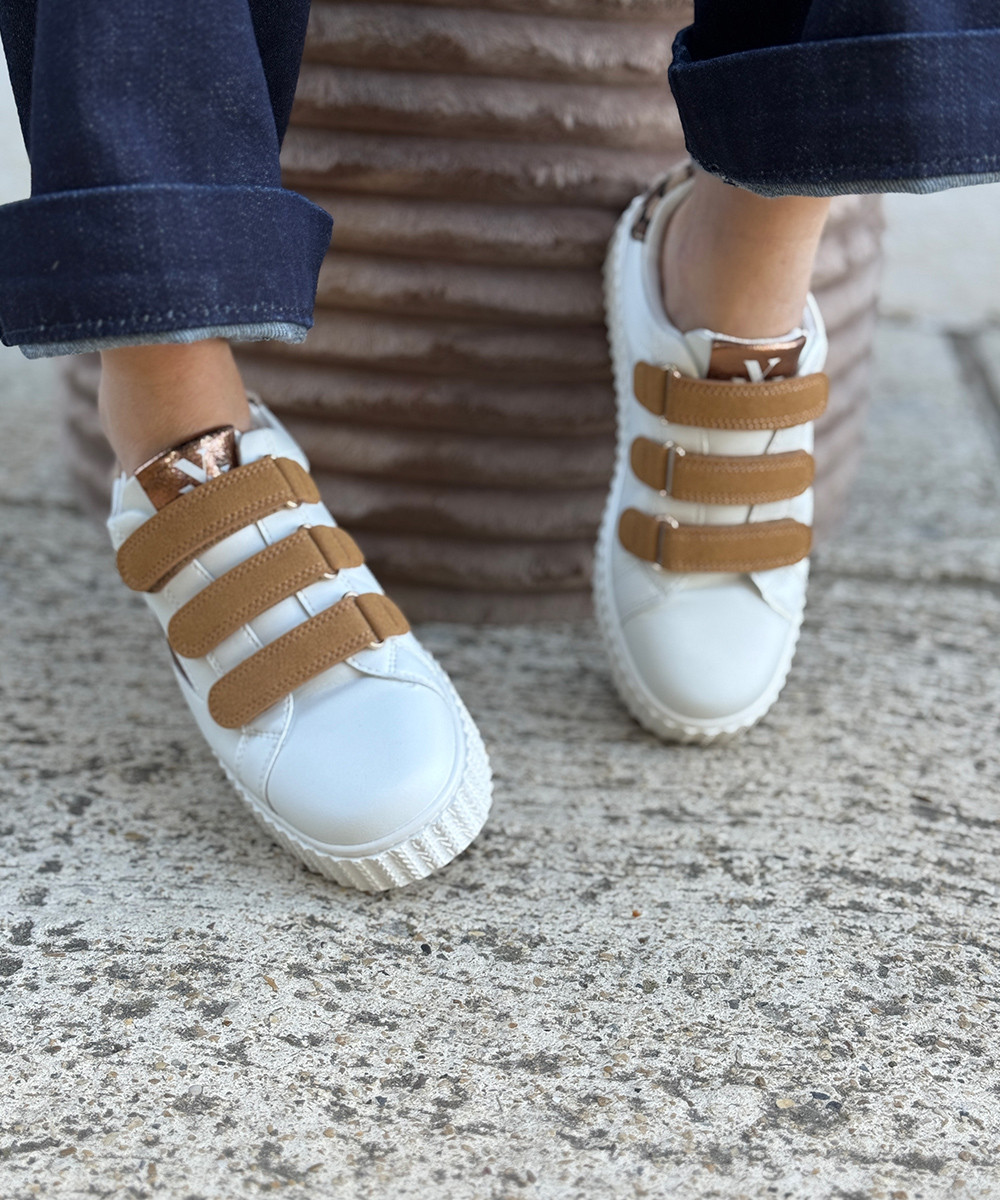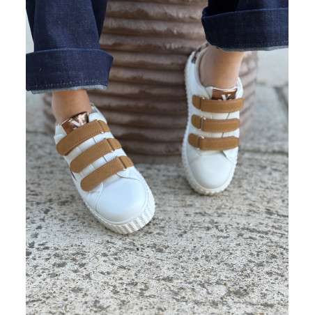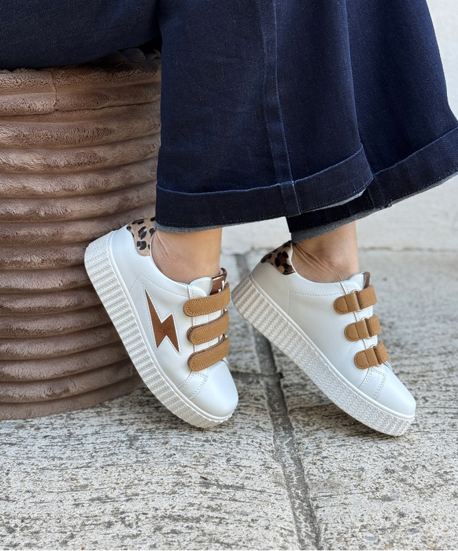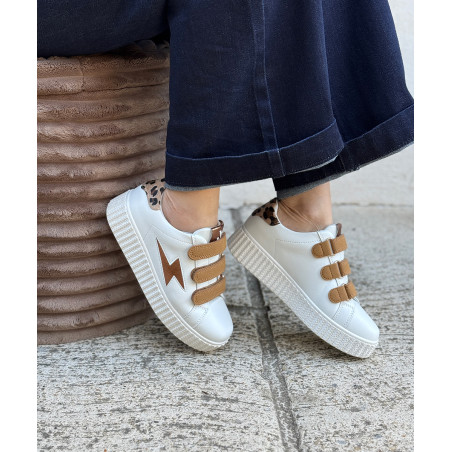 Baskets Vanessa Wu scratchs camel et éclair camel, arrière motif léopard. Semelle intérieure amovible à micro-billes effet massant