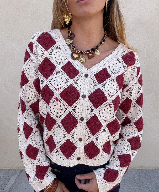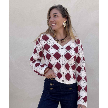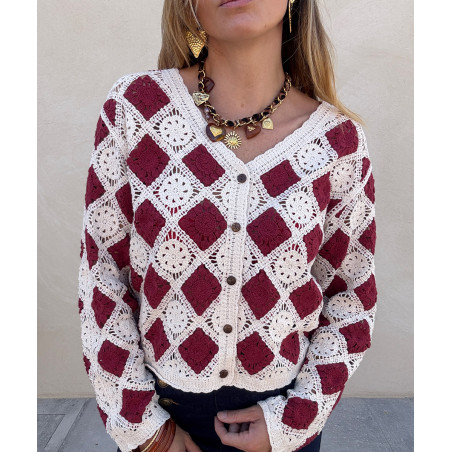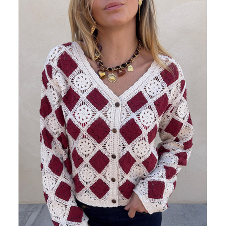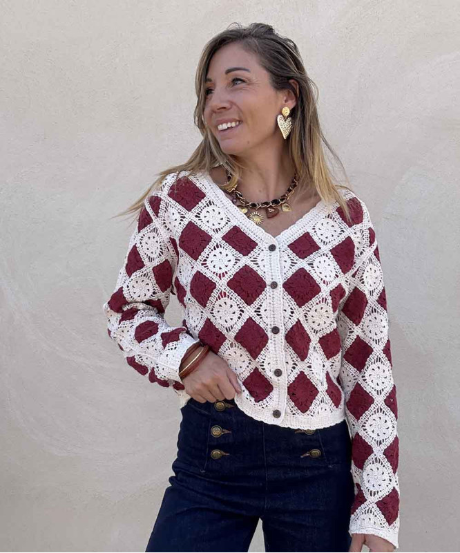 Gilet en crochet bordeaux et beige, taille unique parfait du 34 au 48.