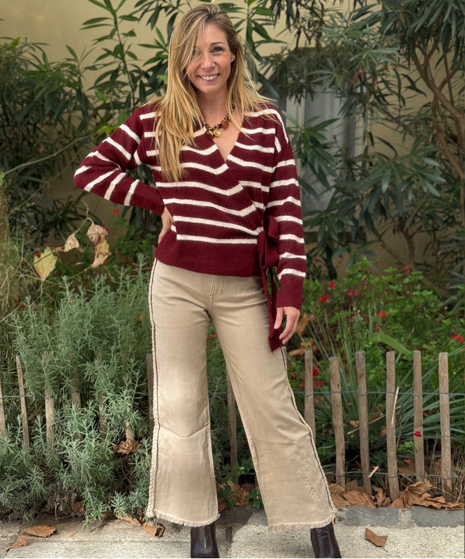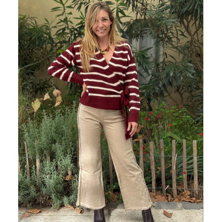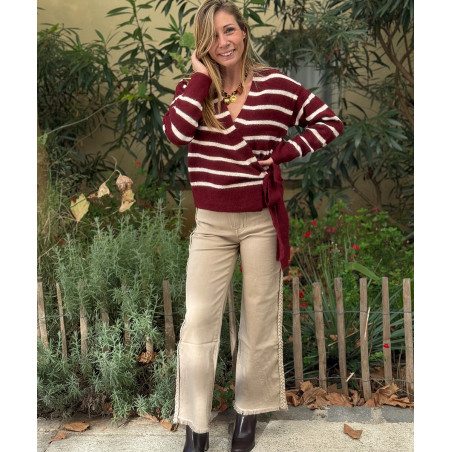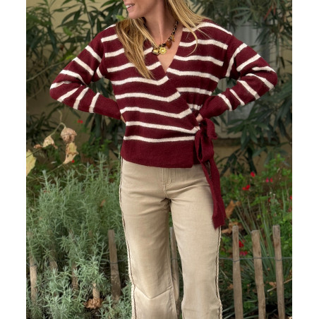 Pull portefeuille bordeaux à rayures blanches