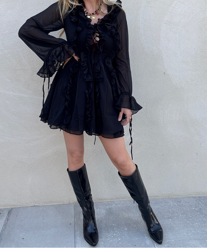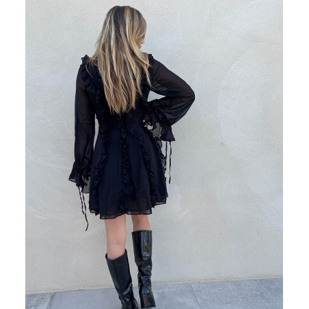 Robe noire à froufrous, S pour le 34-36 M pour le 38 et L pour le 40. Lien de resserrage au niveau du décolleté, manches transparentes, lien de resserage au niveau des poignets. Entièrement doublée