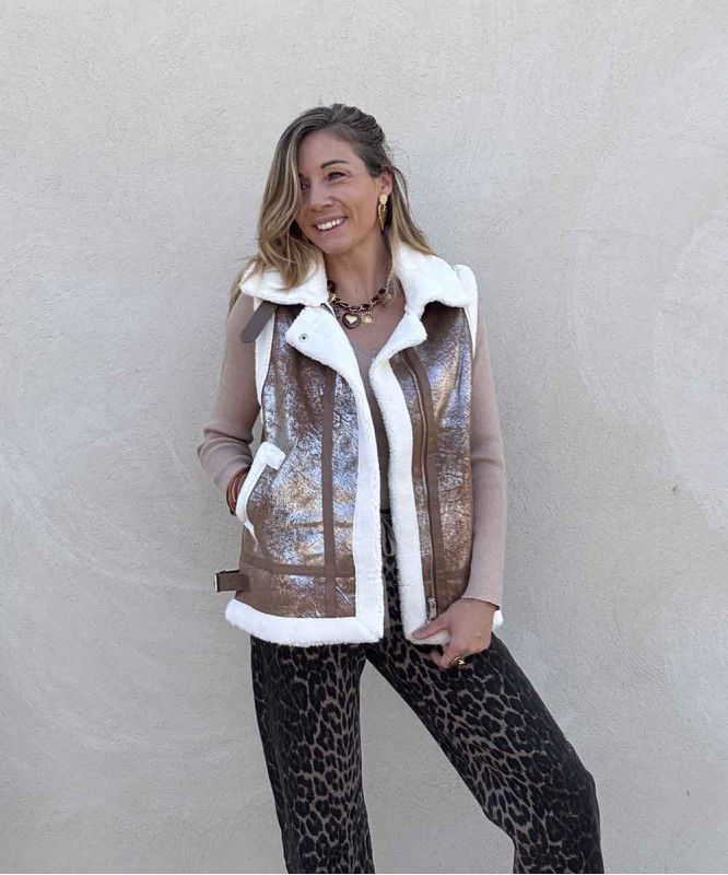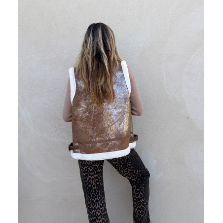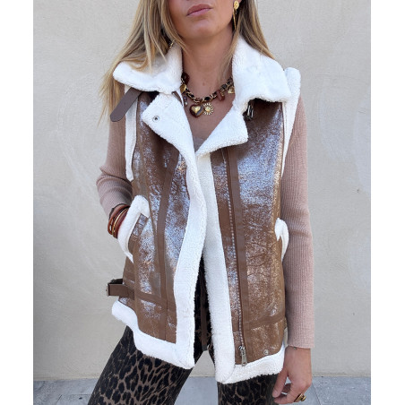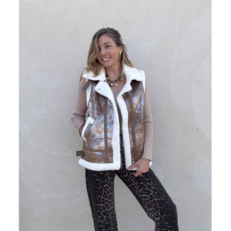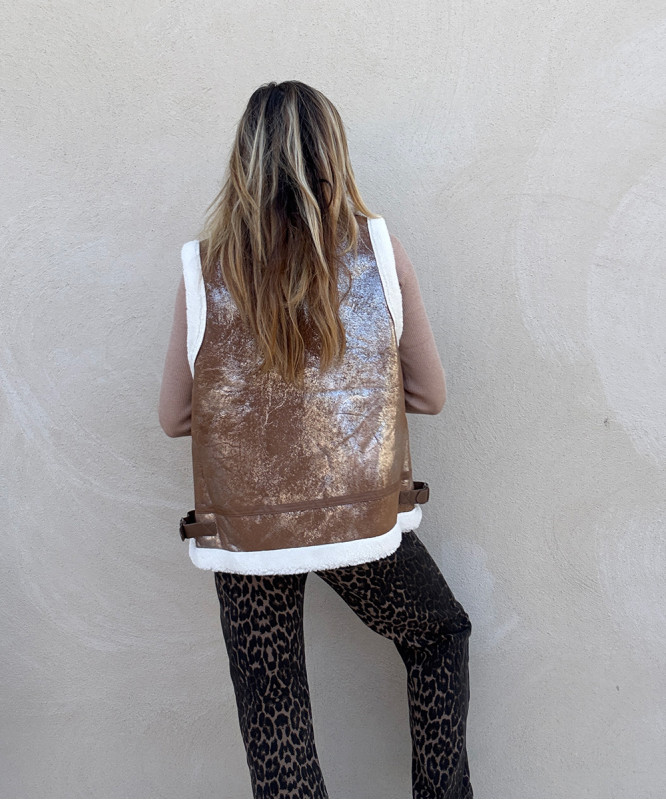 Veste sans manches doublée moumoute effet cuir brillant, coupe oversize. Le S/M correspond au 34-38 le M/L au 38-42